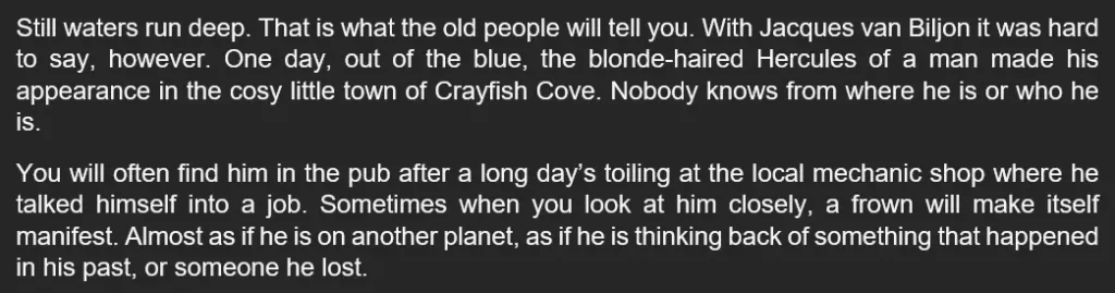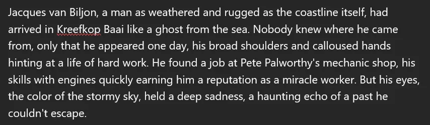 When I first started The Winds of the Wild Coast, I was on the other end of the spectrum. I found that my descriptions lacked substance. They were just superficial or, plainly said, meh. Here is an extract from an early version of Chapter 1.